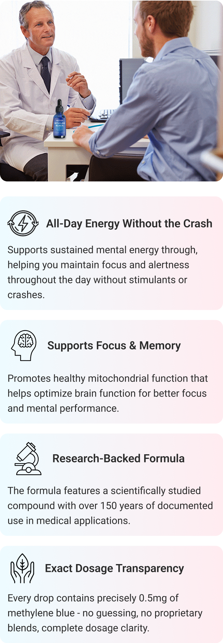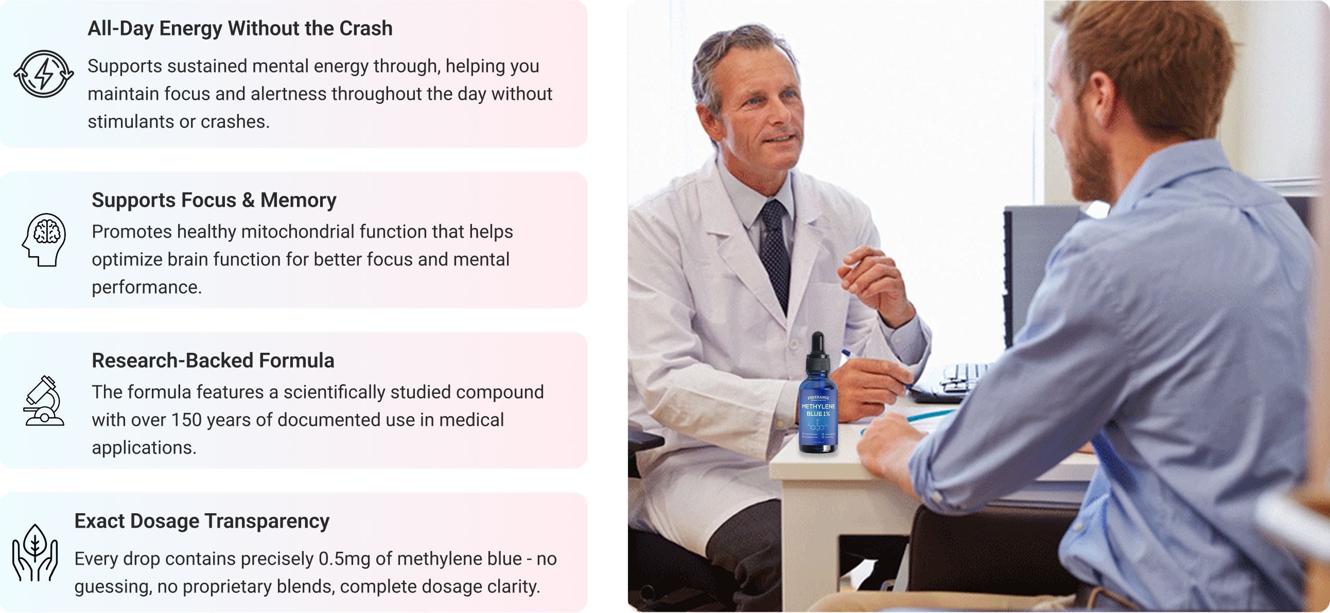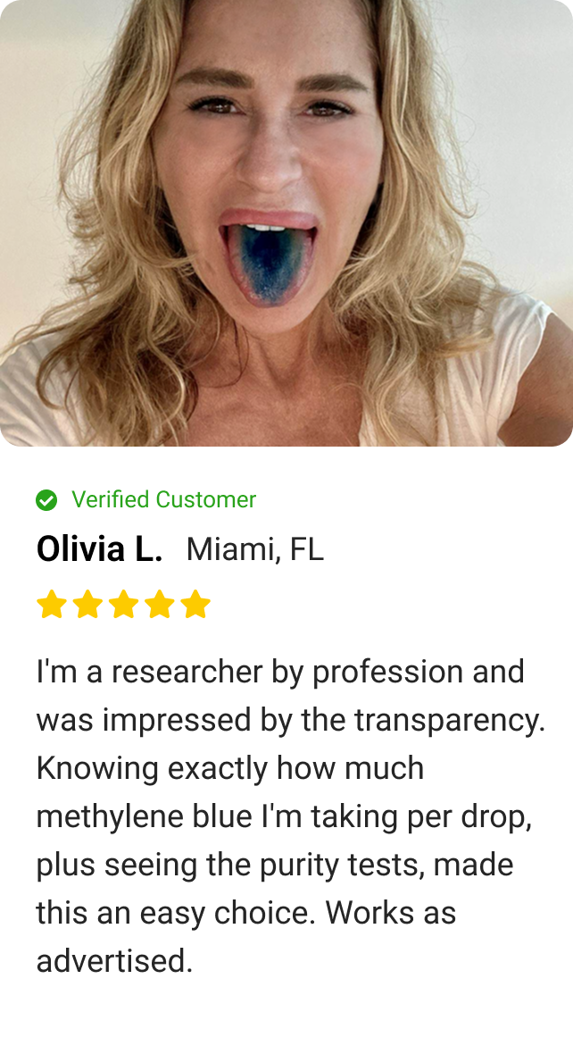 Unlike competitors who use vague dosage descriptions or proprietary blends, each drop of Methylene contains 0.5mg of 99.9% pure USP-grade methylene blue.