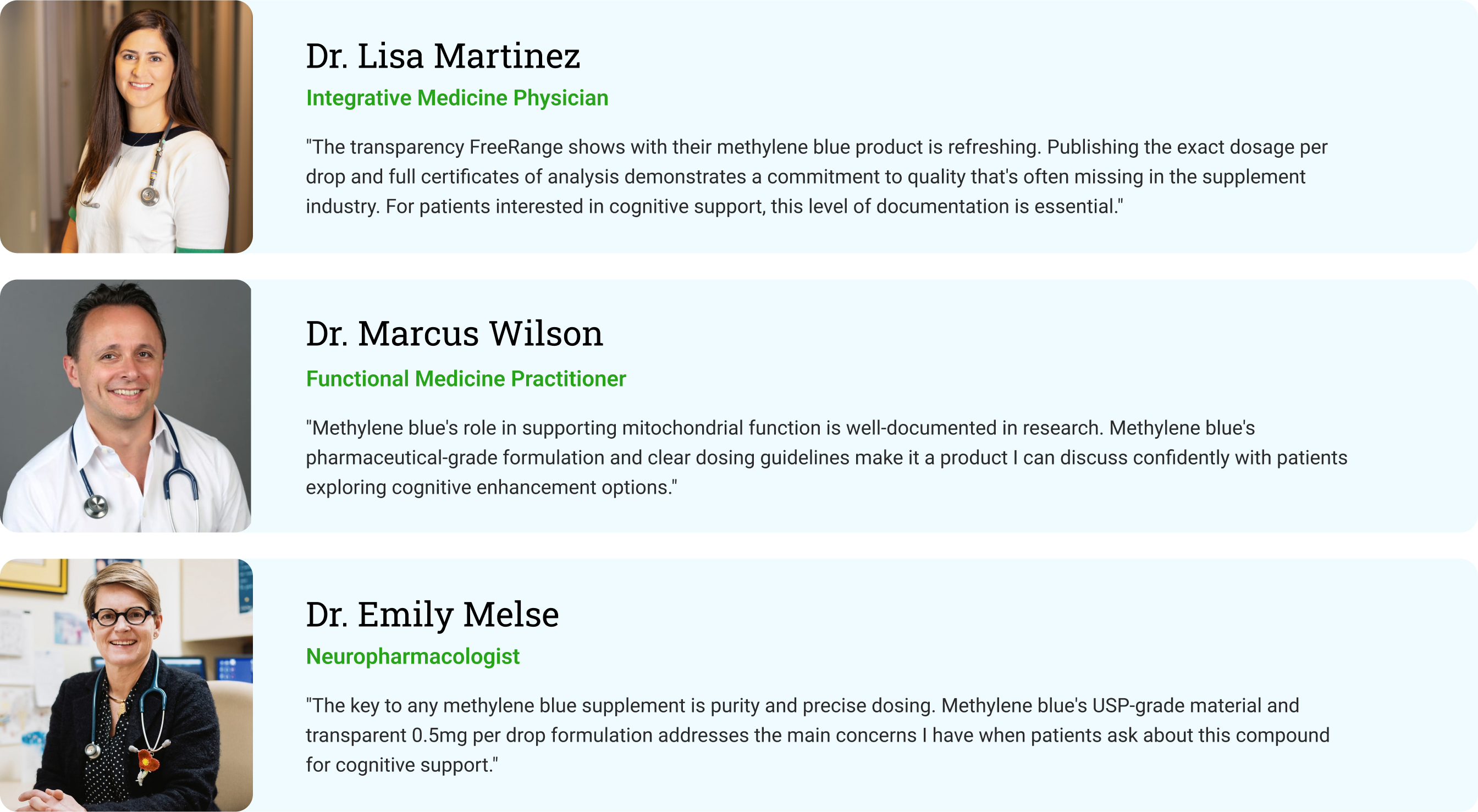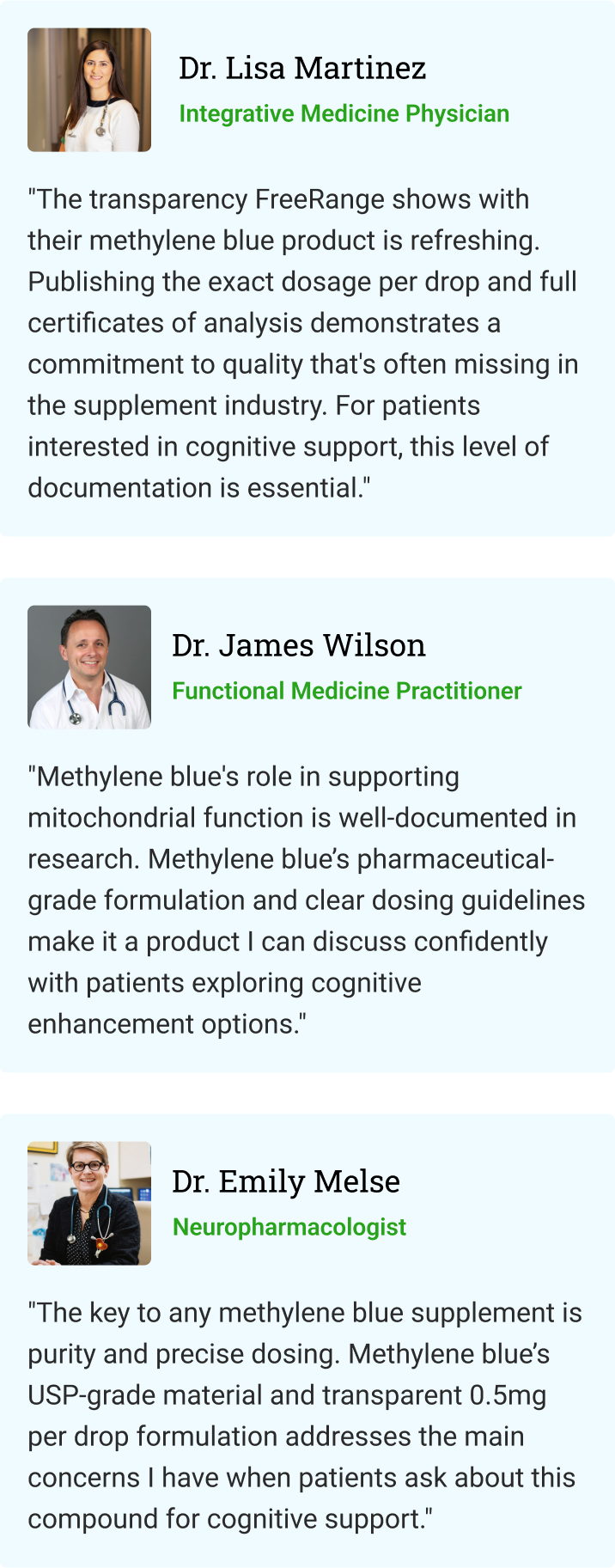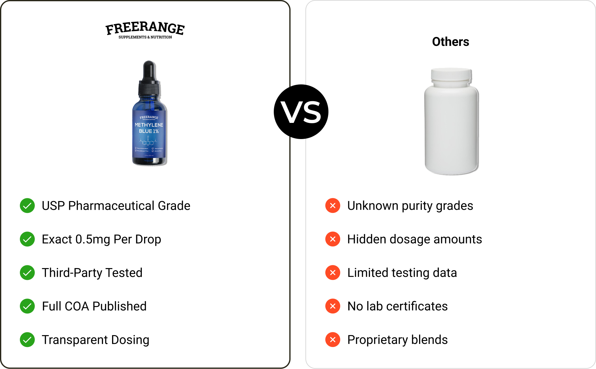 Methylene blue provides exact dosage transparency (0.5mg per drop) and uses USP pharmaceutical-grade material. It also includes certificates of analysis and undergoes third-party testing for purity and potency.