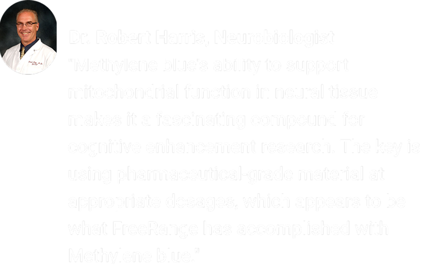 FreeRange Methylene contains methylene blue, which supports mitochondrial function. It helps increase energy levels while reducing brain fog and promoting mental clarity.
